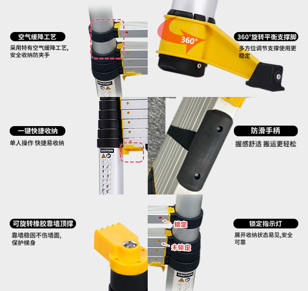 空气缓降工艺,安全收纳防夹手。整梯采用特有空气缓降工艺,收缩缓降,安全可靠防夹手。