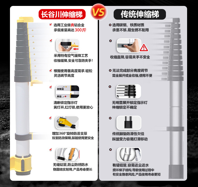 工业级铝合金,承载重量高达150KG,梯身坚固耐用,为使用者提供可靠安稳的支撑。