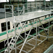为了管理用于调查水质的水槽而制造的步廊。为起警示作用而采用黄色涂料的扶手。