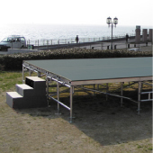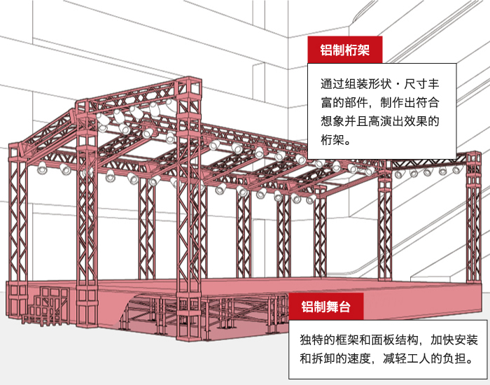 在保障安全前提下的轻量级铝制桁架、组装式舞台、以及观众席。能够在短时间内搭建完工,创造出足够活动空间。