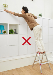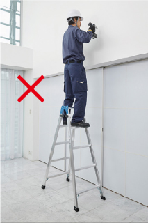 - 在三脚梯上进行作业时,请站在从天板开始数第四节(180cm以下的型号则为第三节)以下的踏板上,身体轻靠天板和上层踏板,在平稳的状态下操作。